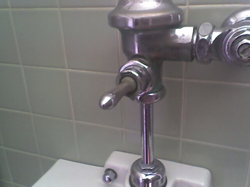 I’ve been in plenty of men’s rooms, but something unique about the handle on this urinal struck me funny: it points directly at the user. As seen in a (rare) men’s room on the all-girls campus of Hollins University in Roanoke.