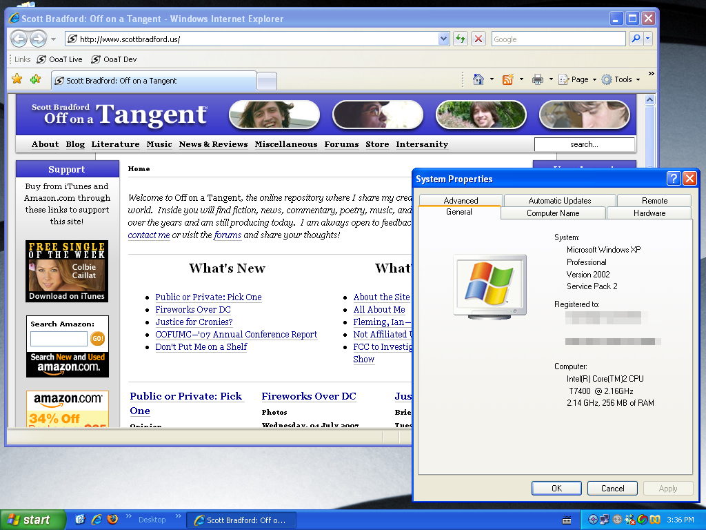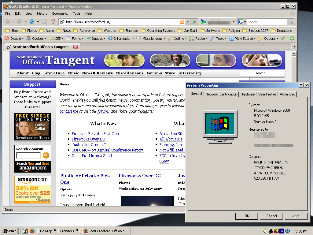 Microsoft Windows XP SP2—Since Windows 2000 doesn’t run Internet Explorer 7 or the Pocket PC emulator (thank you, Microsoft), I have a whole Windows XP install just to run IE 7 for testing web sites and the Pocket PC emulator for mobile web testing. Windows XP runs in Parallels Desktop at near-native speed.
