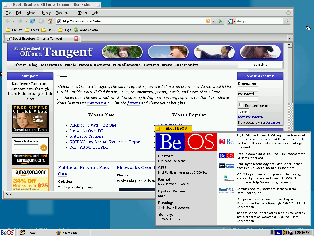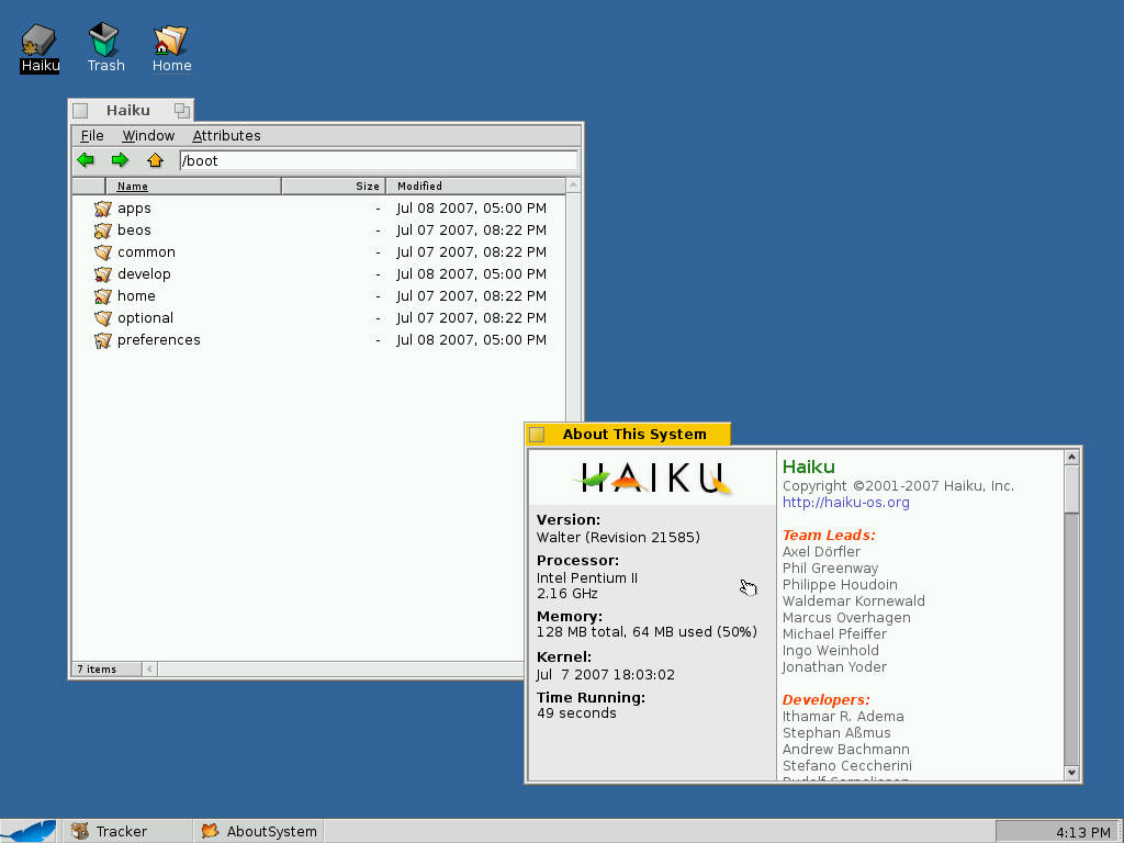 Haiku (Alpha)—Haiku is an open source project to recreate BeOS. It’s come quite a long way, but has limited networking ability so it’s not particularly useful just yet. I’m hopeful that Haiku will grow into a solid competitor for the open source desktop, since it’s more people-oriented than Linux. Haiku is installed in QEMU.