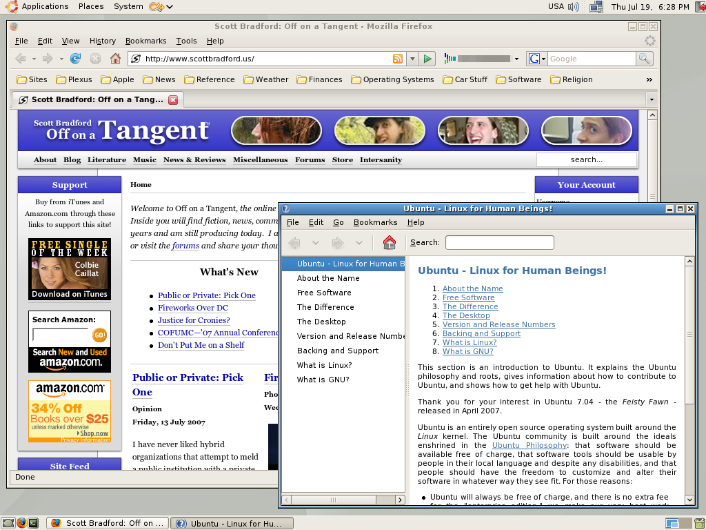 Ubuntu Linux 7.04—This is the current version of my favorite Linux distribution, and one of the few Linux systems that a mere mortal can install and use. In addition to running in Parallels Desktop on my MacBook Pro, I also use Ubuntu to run our apartment file and network server on actual hardware. Slowly-but-surely, Linux is becoming a viable alternative to Windows for people with standard PC (non-Mac) hardware.