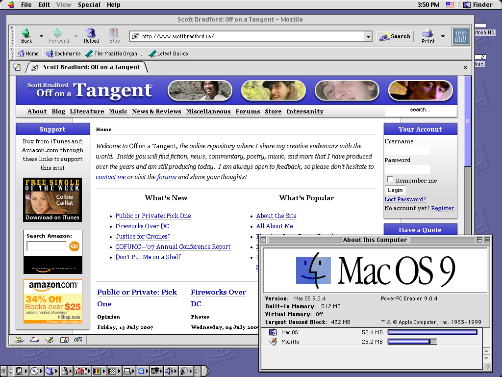 Apple Mac OS 9.0.4—Before the Unix-based Mac OS X system that I love so much, Apple’s ‘classic’ operating system was the only real Windows alternative (Linux hadn’t evolved to where it is today). Since my MacBook Pro has an Intel processor, the only option for running Mac OS 9 on my computer is an emulation product called SheepShaver, and it will only run up to version 9.0.4 (while development continued on ‘classic’ Mac OS until version 9.2). It runs a bit slower than it would natively, but it’s hardly noticeable.