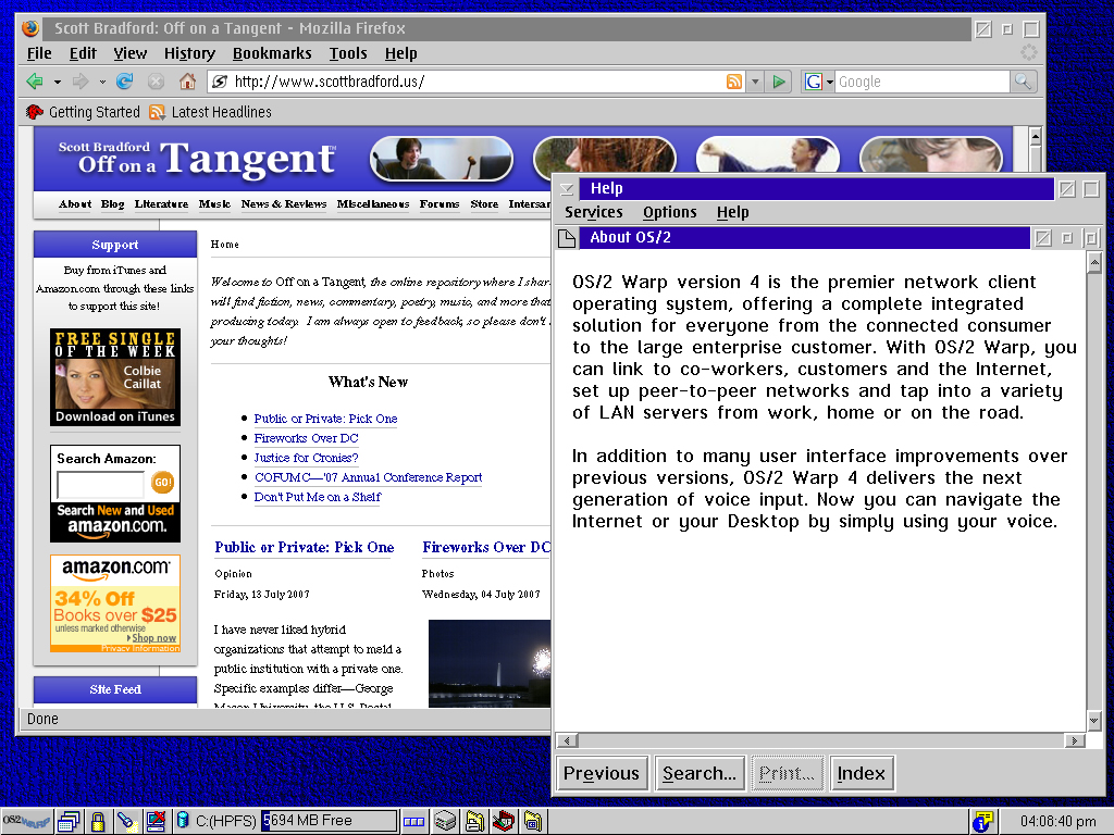 IBM OS/2 Warp 4.52—While Microsoft was pushing Windows 3.1x on the world, they were also working with IBM to develop a better system. Microsoft soon abandoned the project to focus on Windows (and parts of the code were used in Windows NT, which is the core behind Windows 2000, XP, and Vista). Meanwhile, IBM took what they had developed with Microsoft and released a system called OS/2, which I’m running in Parallels Desktop. It never caught on, but it was far advanced of where Windows was at the time.
