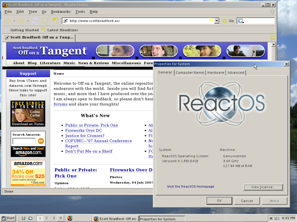ReactOS 0.3.1—ReactOS is an open source project to create a free, Windows-compatible operating system. It runs many programs, but few of them perfectly (see Firefox in this screenshot, with discolored icons and black gremlins on my web site). Maybe, someday, ReactOS will be available for people who absolutely must have Windows compatibility and don’t want to give Microsoft their money. ReactOS is installed in QEMU.