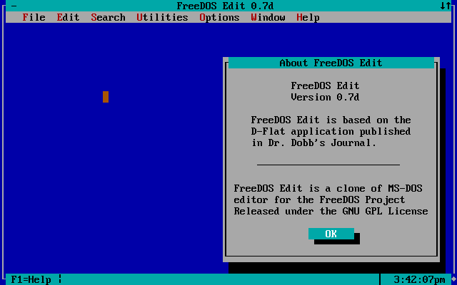 FreeDOS 1.0—FreeDOS is an open source version of DOS and compatible with MS-DOS and other legacy DOS systems. This screenshot shows the built-in text editor, but I’m successfully running Word Perfect 5.1 and other DOS programs I remember from yesteryear in this Parallels Desktop install. Ah, memories.