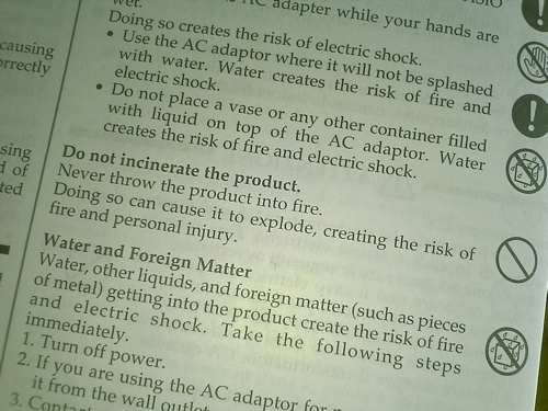 Melissa was going through our manuals (we have a stash, especially for our more expensive stuff), and found this gem on the product warnings page for her full-size Casio digital piano. Yes, for those of you who were planning to throw your full-size digital piano into a fire, you should be aware that there is a risk of the piano exploding.