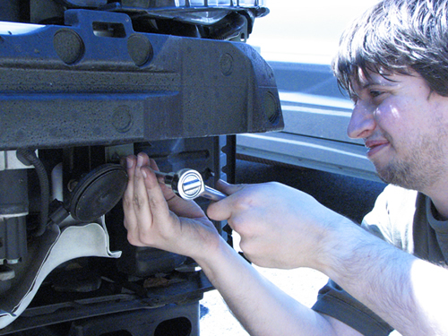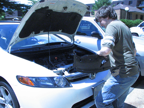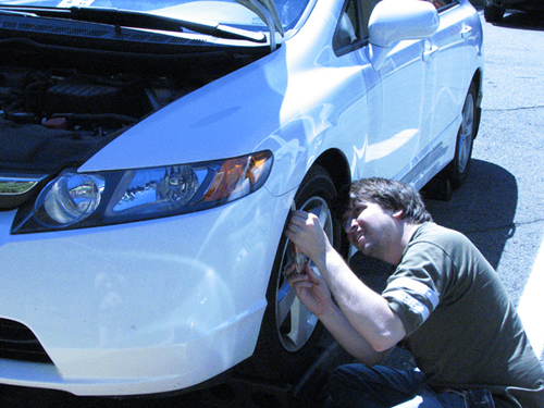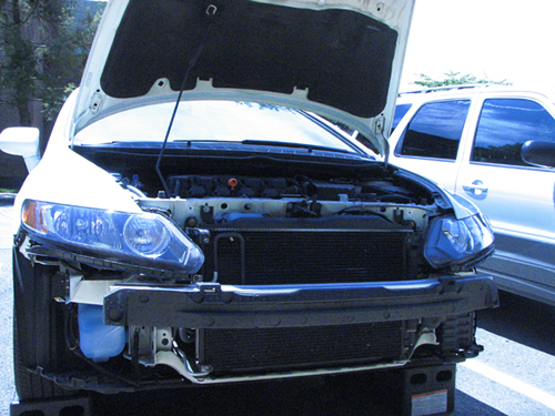 As part of my newfound interest in maintaining and repairing my vehicles myself, I figured that replacing the Civic’s horn would be a good weekend project. So I made another run to the auto parts store, picked up some ramps and chocks, bought a $20 low-tone horn (the ‘Freeway Blaster’ ;-)) and got to work. Mind you, this is not as easy a job as it sounds—on 8th generation Civics, replacing the horn requires the removal of the front bumper panel and grille assembly.