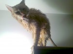 Mei Mei, our goofy little orange tabby, is not a big fan of getting baths. This is pretty standard for a cat, but—since Melissa is allergic to cats—regular cleaning is part of Mei Mei’s life. My favorite part of this process is how, afterwards, she looks like a giant, spiky, wet rat. Today, she jumped up on some furniture in my office, perched herself right over the lamp, and commenced her drying-out (which involves standing in curious yoga poses and licking herself).