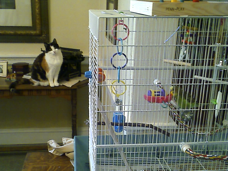 My sister’s cat, Zoe, is probably the dumbest cat I have ever met. That’s okay though, she’s funny sometimes. For example, this morning while we were eating lunch after church, she decided she was going to keep a careful eye on Tarzan the parakeet. Patiently sitting on a nearby table, she watched . . . apparently contemplating how to get into the cage and eat the prey without arousing suspicion. Finally, after a few minutes, she gave up and went back to complaining and making growling and hissing noises at people for no reason.