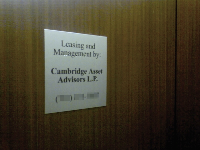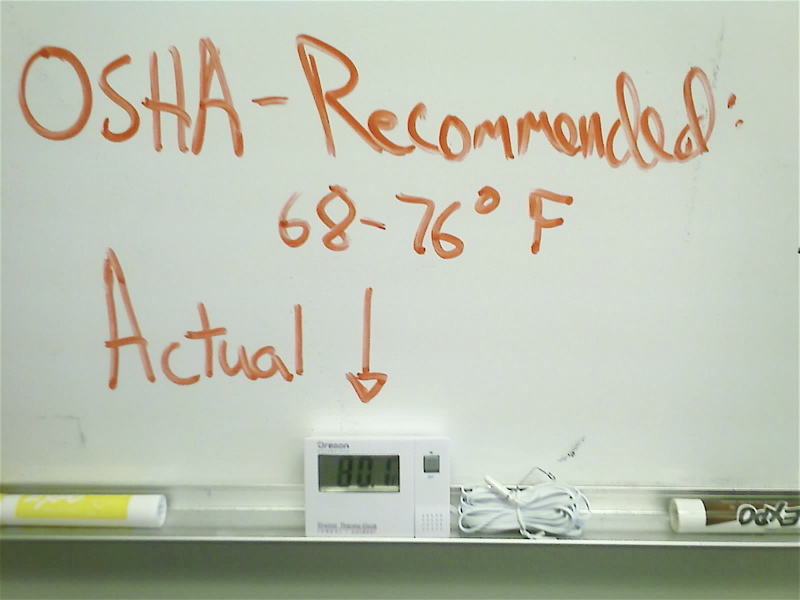 . . . but I especially hate hot weather indoors. My employer is located in a building ‘managed’ by Cambridge Asset Advisors L.P., and it seems to be the only building in the country that has an air conditioning system but isn’t maintained in a moderately comfortable state by the building managers. As a small protest, my office white board now has the OSHA recommended temperature range (68-76º Fahrenheit) and, just below it, the current office temperature. Today, it’s 80.1º Fahrenheit in my office—4.1 degrees above the temperature range OSHA recommends. Given that Cambridge has been aware of temperature issues in this building for more than two years now, I figured it was time to call them out on their gross incompetence.