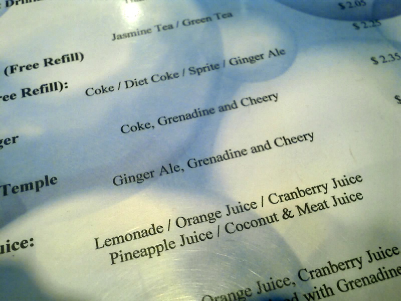 Melissa and I had dinner last night at a nearby Thai restaurant that we enjoy, and had to have a laugh at the drink menu. In fact, I just submitted this photo to the ever-hilarious English Fail Blog. I can’t decide which part I find more humorous: the twice-misspelled word ‘cherry’ (printed as ‘cheery’) or—the part I didn’t even notice until reviewing the photo at home—the ‘Coconut & Meat Juice’.