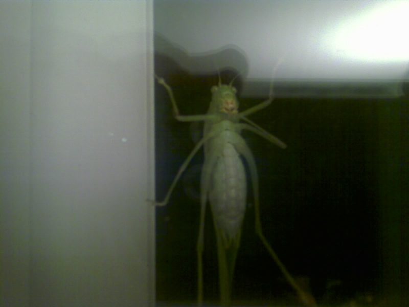 So, I was sitting in front of the television last night watching Cops or Forensic Files or something when the cat, ever busy amusing herself, began jumping up and down by our sliding glass door. After she did this a few times, I figured there must be something there getting her attention. Sure enough, this little green bug was livin’ it up on our back door.