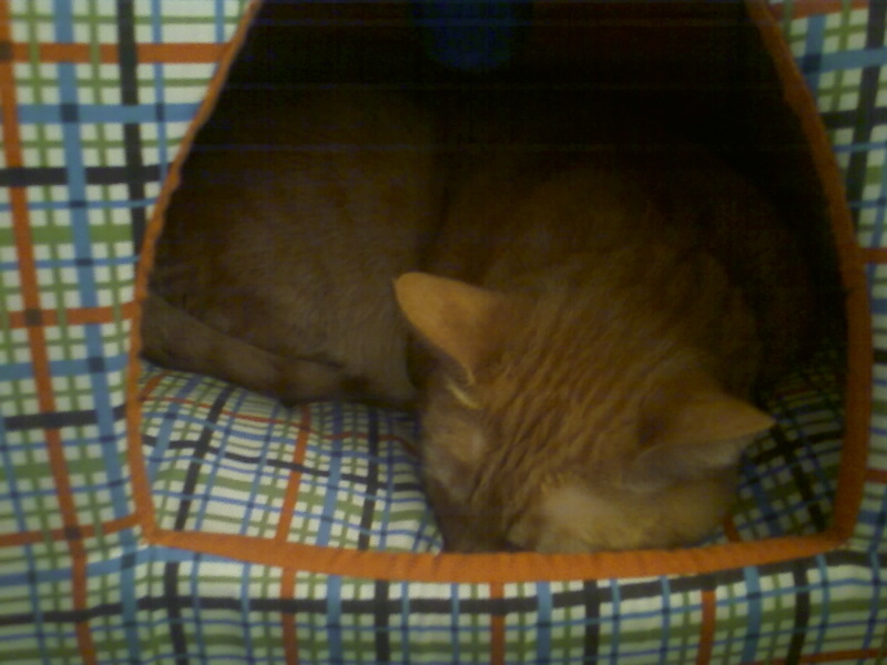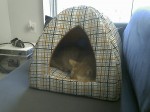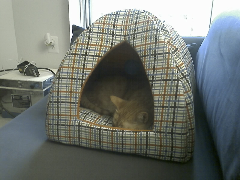 Melissa bought Mei Mei some funky little plaid cloth igloo thing, since, you know, we spoil the cat. Luckily, unlike some of our other efforts to spoil her, she loved this one. Before Melissa even got all the way into the apartment with it, the cat was trying to get into it. In the week-or-so since we got it, the cat has been sleeping in it nearly every afternoon. I guess we (well, Melissa) did good.