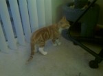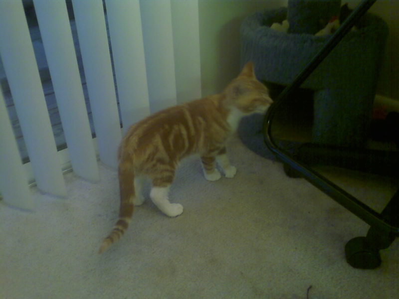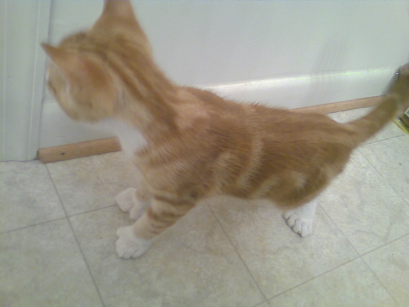 Anyway, Mittens Vincent—aside from his neat little paw deformity—is your average male orange tabby with white highlights on his feet and belly. He’s about four months old, so he’s still just a kitten. Hopefully, Mei Mei will pick up a slight maternal instinct toward him with a little time . . . but right now we’re just trying to convince Mei Mei that the newcomer is not Satan and need-not be hissed at every time they see one another.