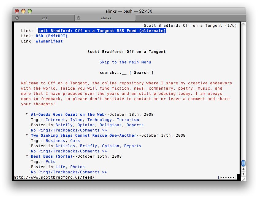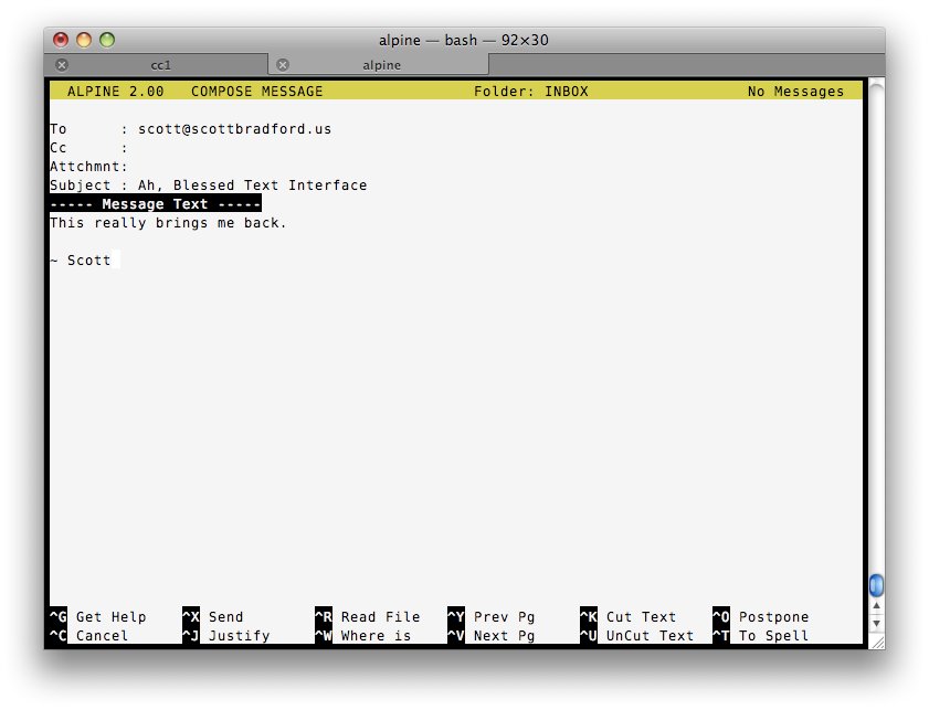 In the UNIX/Linux world (which includes Mac OS X, especially if you install MacPorts), there are a couple essential programs that allow you to live in the command line world for a while. ELinks is a capable text-based web browser. Alpine is a text-based email program (loosely related to the somewhat well-known PINE system, which has been discontinued). There’s also the Nano text editor (as well as the much more difficult, though immensely powerful, Vim and Emacs editors).