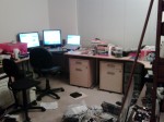 Well, so far, all the furniture is where it needs to be, I finally got the computers all back in-place yesterday, and the files from the file cabinet are properly in their new file cabinets. But there are mindless, disorganized messes of . . . stuff . . . all over the place, as you can see in the photo (and there’s plenty more just out of view on the left, right, and below the camera). But progress is being made. Slowly.