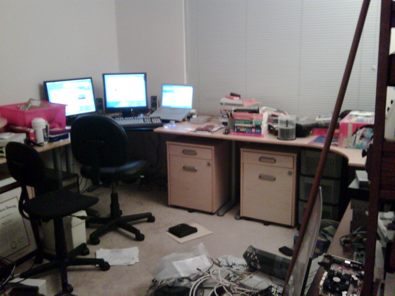 In case you are wondering, the desk and drawer units are all from the Ikea ‘Galant’ family. I bought the two corner disks and the extension (on the left) and the smaller drawer unit (barely visible behind the GMU degree on the left) from my friend Christine, then added the two drawer units in the middle and some shelves (off to the sides; not visible) from Ikea. The Eelserver, which is our apartment file and network server, along with our DSL modem and wireless router are all under the desk at the back-right corner, with the printer on the right just out of view on top of the desk. My main workstation is at the back left corner (where the monitors are).