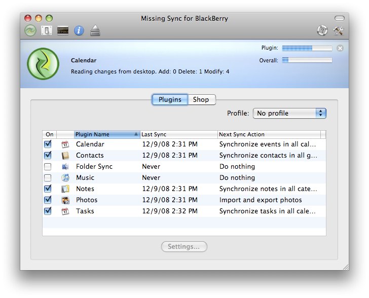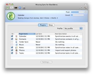 Missing Sync for BlackBerry does all the standard stuff—syncing contacts, calendars, tasks, and notes between the BlackBerry and the Mac. Mark/Space provides a useful notes viewer, since there isn’t a ‘standard’ Mac application for notes/memos, and will automatically sync any photos you take on the phone into iPhoto. My only complaints are that there doesn’t seem to be a video sync plugin, or automatic sync of voice memos (even though Missing Sync for Windows Mobile does both). I’d like to see those features added.