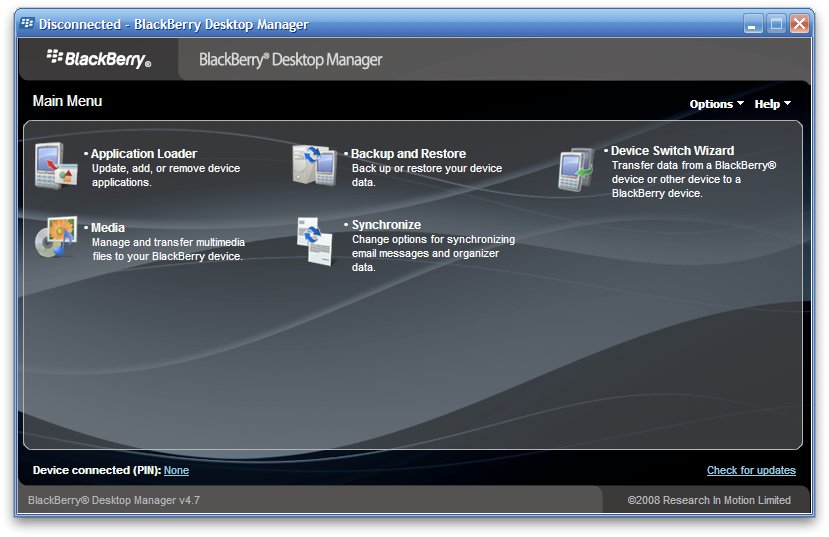 The BlackBerry Desktop software is provided free of charge by RIM, but it is available only for Microsoft Windows. This software allows you to perform full device backups and restorations as well as install software and OS updates, in addition to basic synchronization features. Through a licensing deal with PocketMac, RIM also provides a free copy of PocketMac for BlackBerry to allow synchronization with the Mac OS X address book and calendar software. Admittedly, I didn’t even try PocketMac and went straight to the more-familiar Mark/Space Missing Sync for BlackBerry (I have had good experience with Missing Sync for Palm OS and Missing Sync for Windows Mobile in the past). At $39.95, this might be something you only try if you have problems with PocketMac.
