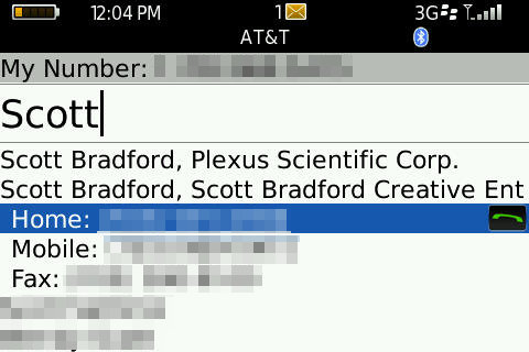 The Bold also includes a pretty cool voice dialing feature, which is accessible directly from the phone or through a Bluetooth wireless headset. Instead of having to be ‘trained’ like most voice dialing systems I’ve used before, this one uses real voice recognition. If I say ‘Call Scott Bradford’ (clearly), the phone will ask me to confirm (‘Yes’) and then it’ll call Scott Bradford without any training. This feature also allows you to check signal strength (‘Check Signal’) and various other things without touching the phone, which is great when you’re driving. The Bluetooth radio, however, does not seem to be as strong as the one in my 8525 and succumbs to interference with the slightest obstruction (like my old Treo 650 did).