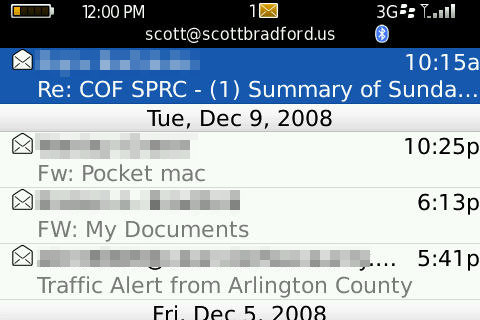 The Bold came closest to meeting my requirements, but it did not meet them completely. I didn’t like the ‘BlackBerry Way’ of doing email and had some misgivings about the relatively limited PIM functions, but I went ahead and took the plunge because I could find nothing better. Much to my surprise, after a solid week-and-a-half as a BlackBerry user, I’m finding that I actually like it quite a bit and—dare I say—am completely satisfied with my choice.