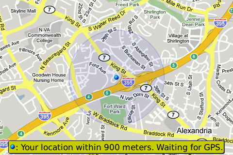 Most phones support a mediocre location discovery system based on cell tower locations, allowing almost anybody to approximate their location (as you can see at the right). On GPS enabled devices (or using an external Bluetooth GPS receiver), Google Maps can pinpoint your exact location. Even if it can’t get a GPS signal because you’re indoors (as I was when I took the screenshot), the tower-based approximation will still work.