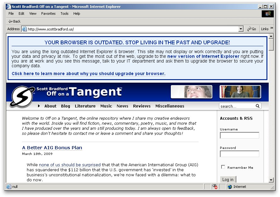 If you are still using Internet Explorer version 6, please pay attention to the following important Off on a Tangent Support Notice: