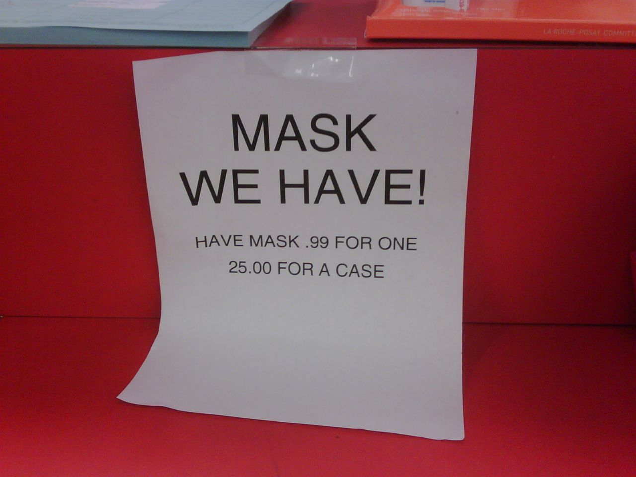 “MASK WE HAVE!” it says. “HAVE MASK .99 FOR ONE[,] 25.00 FOR A CASE.”