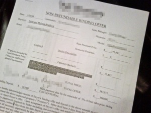 If the offer is accepted as-is, we’re committed. If the offer is not accepted, the builder would make a counter-offer and we would (hopefully) negotiate something we can all live with. Of course, if the builder won’t give enough for everything to work out with our finances, we’ll have the option to walk away. We’re only committed if the offer is accepted as-submitted.