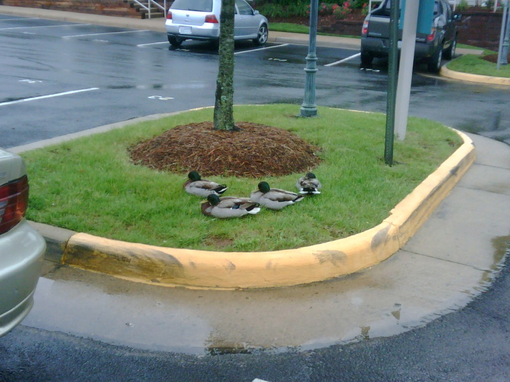 Second, I got home around the time that the drizzle of rain had stopped and when I got of my car I noticed . . . ducks! For some reason four ducks were huddled together on the little parking island and looking somewhat forlorn. They seemed like they didn’t want to have their picture taken, but they actually let me get pretty close for this shot.