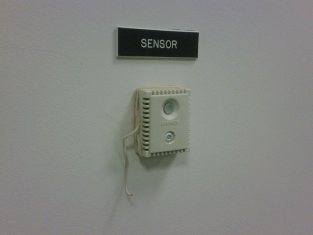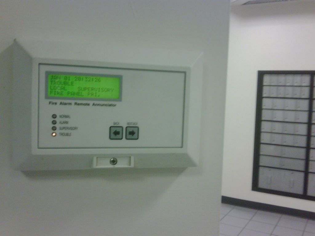 I discovered two interesting things on the wall of the local Post Office. First, what appeared to be a fire alarm panel helpfully declaring that there was ‘trouble’. As far as I could tell, the building was not on fire so I didn’t worry too much about it. Second, a wall wart of some sort with a helpful sign identifying it as a ‘sensor’, featuring a button labeled ‘override’ and a rubber band.