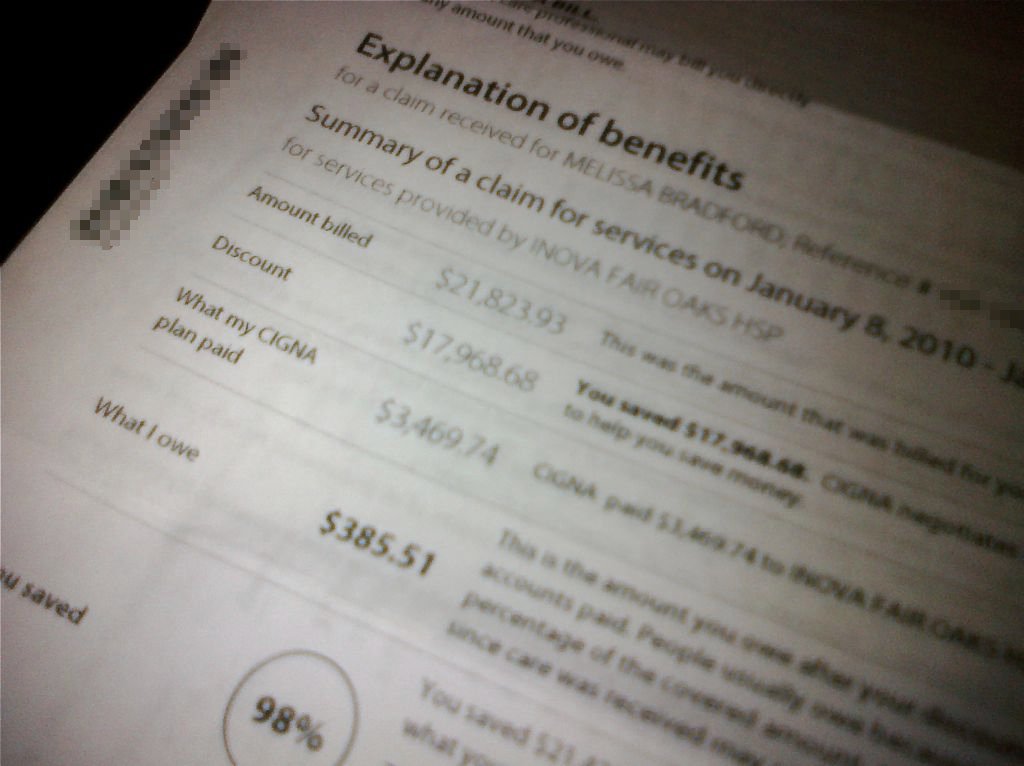 The total hospital bill was $21,823.93, but we only have to pay $385.51. Not bad, huh?