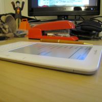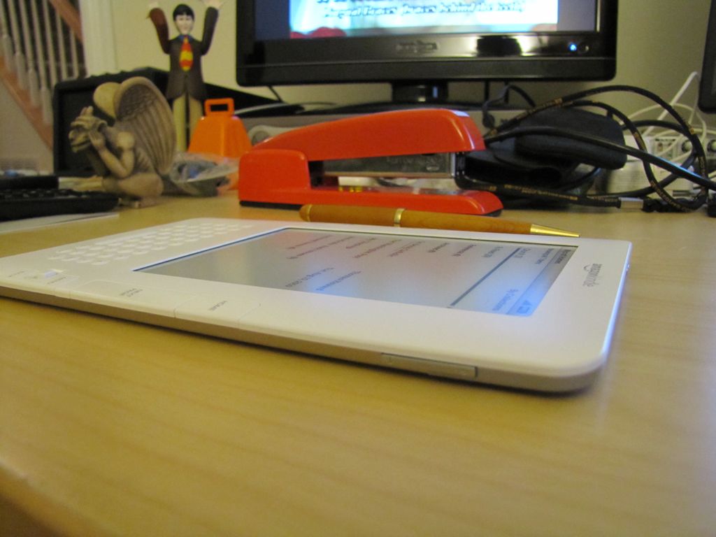 Overall, I really like the Kindle’s size and ergonomics. The large ‘next page’ buttons on either side of the display seem to line up perfectly with your thumbs when you hold it naturally, and the five-way navigator nub makes it quick and easy to get around the menus and lists of books. The Kindle includes a physical keyboard (where the Nook has its secondary touchscreen). This is nice when I need to enter a quick note, but doesn’t get a lot of use day-to-day. Personally I’m kind-of torn about this. The keyboard seems like it’s a waste of space that might be used for something else (like the Nook’s touchscreen) but, at the same time, I find that the Nook’s touchscreen makes it feel more like a gadget and less like a book. Books, of course, don’t have keyboards . . . but there’s something about the physicality of buttons, as opposed to displays, that I like about the Kindle. It feels ‘real,’ instead of like a window into some electronic universe.