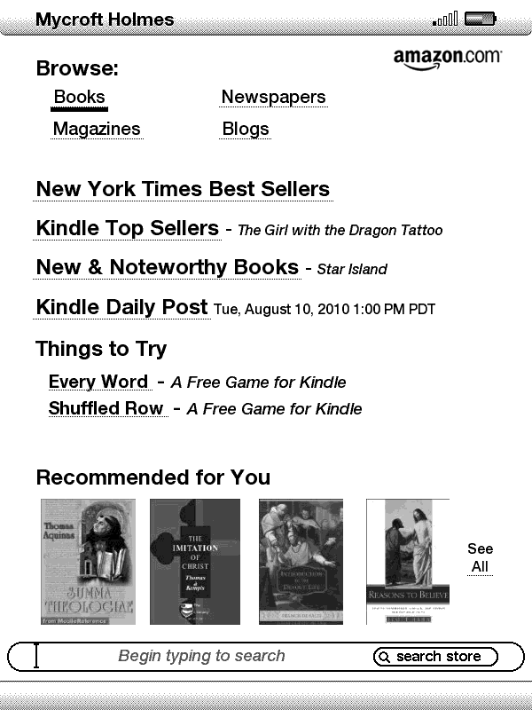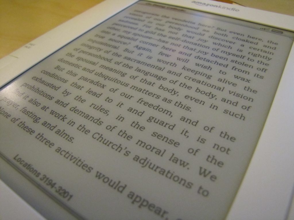 I would like to see a way to scan a book’s bar code (or some other fairly easy method) and get a discount on that book through the Kindle store. I don’t expect it for free, especially considering that it costs Amazon to operate the ‘Whispernet’ connection over-which it’s delivered, but if I bought a $30 hardcover it seems a little silly to have to spend full price to buy it again. The publishers already got my money (and already ‘licensed’ the content to me, according to their tortured understanding of copyright) . . . so let me use it on my exciting new device that is going to be notable part of the salvation of the publishing industry. So far I’ve only re-bought two books (not counting the Bible), and both of them were priced well-under $5. No way am I paying over $5 to gain access to a book I already bought.