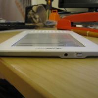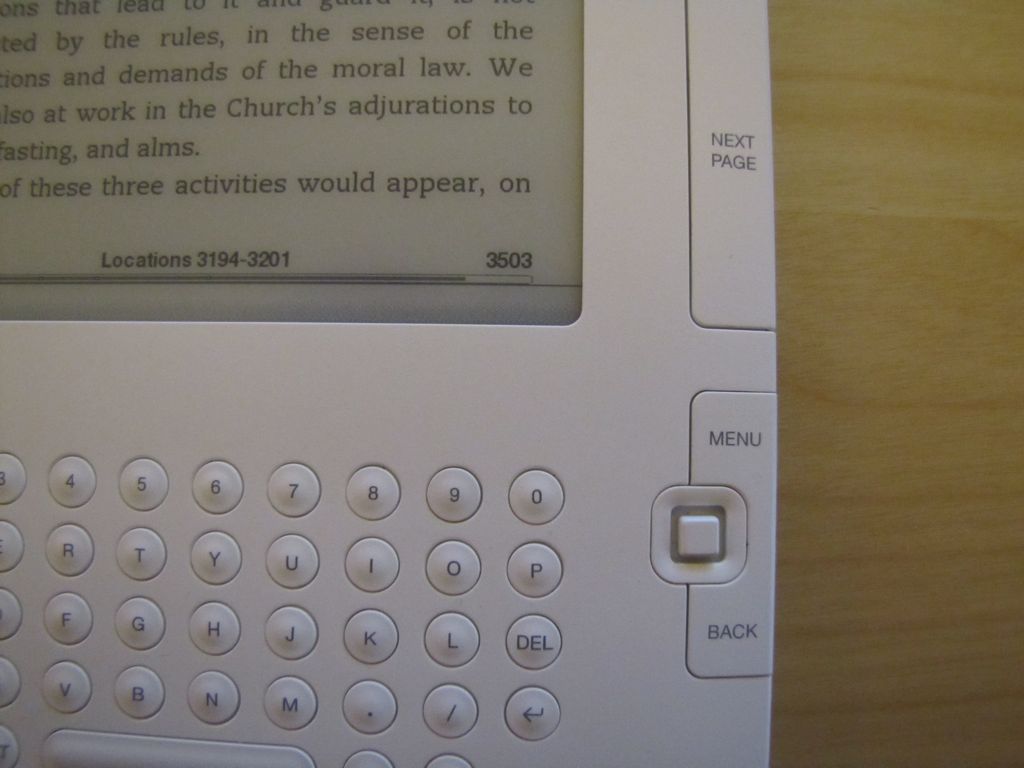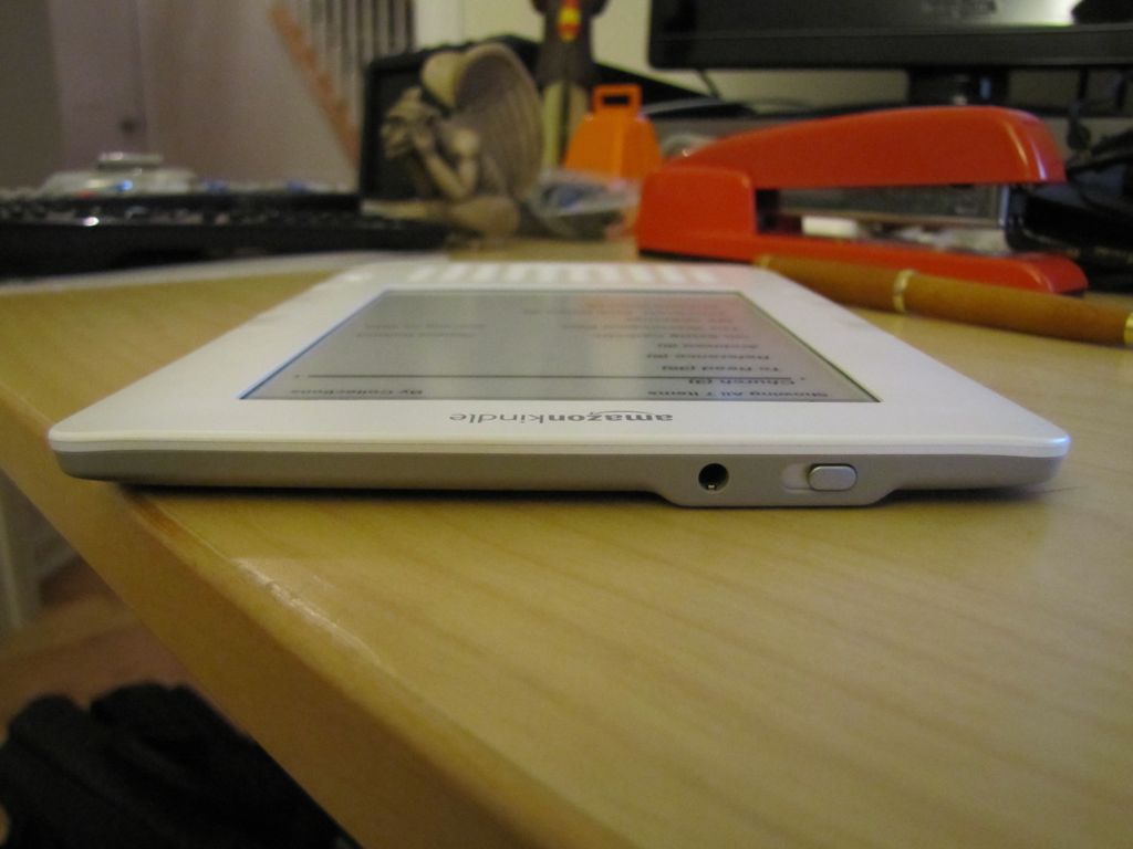 Besides the keyboard and the basic array of navigation buttons, the Kindle has a power slider switch on the top and a standard headphone plug (for listening to audiobooks, MP3s, or so the Kindle can read to you). The volume toggle is on the upper-right hand side. On the bottom it has a standard mini-USB port for charging or connecting to a computer. On-board memory is 1.4gb, which is plenty of space for tons and tons of books. The new Kindle replaces the five-way navigator nub with a different arrangement, but it seems to me that it won’t be much better or worse. The new one is also quite a bit smaller—although the screen is the same size on the new Kindle, they have greatly reduced the size of the bezels around it. It also more-than doubles its memory to 4gb.