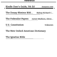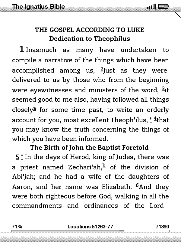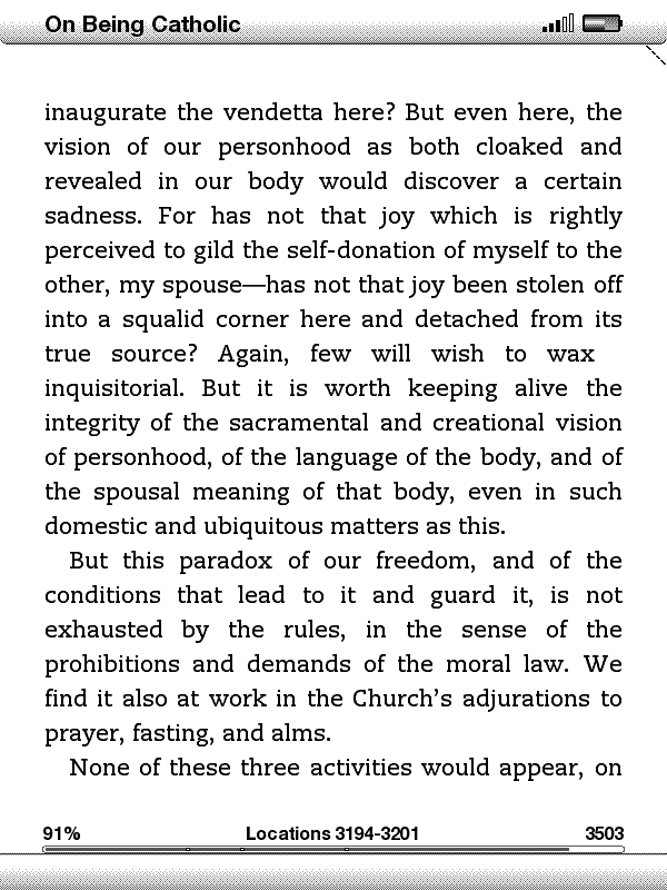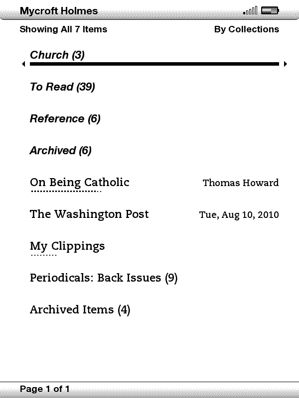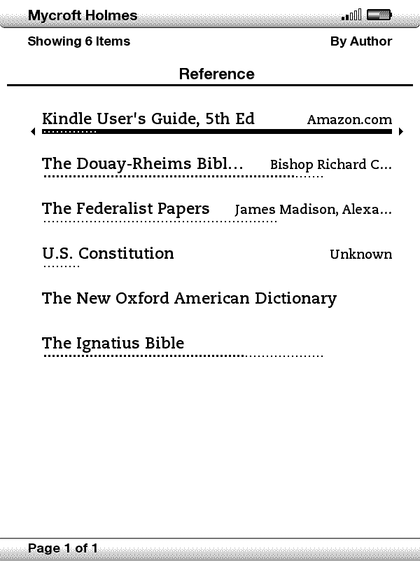 When you start up the Kindle, you’re presented with a very straightforward home screen. You can choose to sort it by title, author, or by ‘collections’ (folders, basically). I find it easiest to sort by collections. Books I’m currently reading I intentionally leave uncategorized so they appear on the home screen, while everything else is nestled in one or more collections. I basically leave mine broken down into ‘To Read’ (items I haven’t read yet), ‘Archived’ (items I’ve finished reading), ‘Church’ (Bibles, Missals, etc.), and ‘Reference’ (a dictionary, Bibles, the Constitution, and more). You could certainly break things down even more if you wanted to.