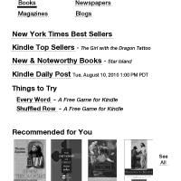 In addition to books, you can subscribe to a large number of newspapers and periodicals through the Kindle store. These are billed on a monthly basis to your Amazon one-click account, and are generally quite a bit less expensive than their print counterparts (and, even better, they don’t come loaded up with all the advertising you see in print). Periodicals are delivered magically through Amazon’s ‘Whispernet’ when they come out.