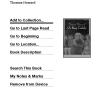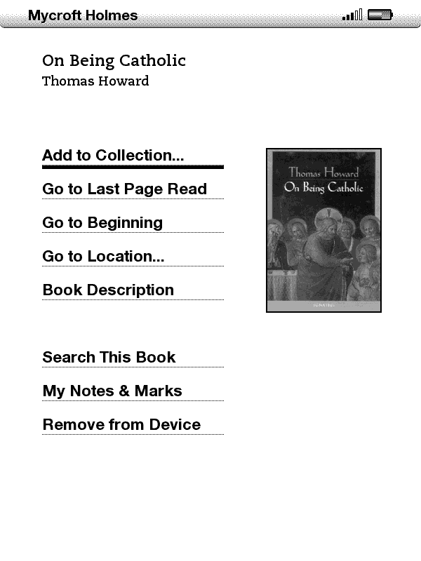 When you click on a book with the five-way navigator from the home screen, it takes you directly to wherever you were last time you were reading it (or, if you haven’t read it before, it takes you to the beginning—usually past all the pointless acknowledgements and copyright notices). You can also tap to the right on the five-way to get the book’s information like its title, author, and cover. From this screen you can also navigate through the book, view your notes and marks, or search inside the book. This is also one place that you can add a book to one or more of your collections (you can also do this from the collection’s page en-masse).