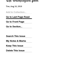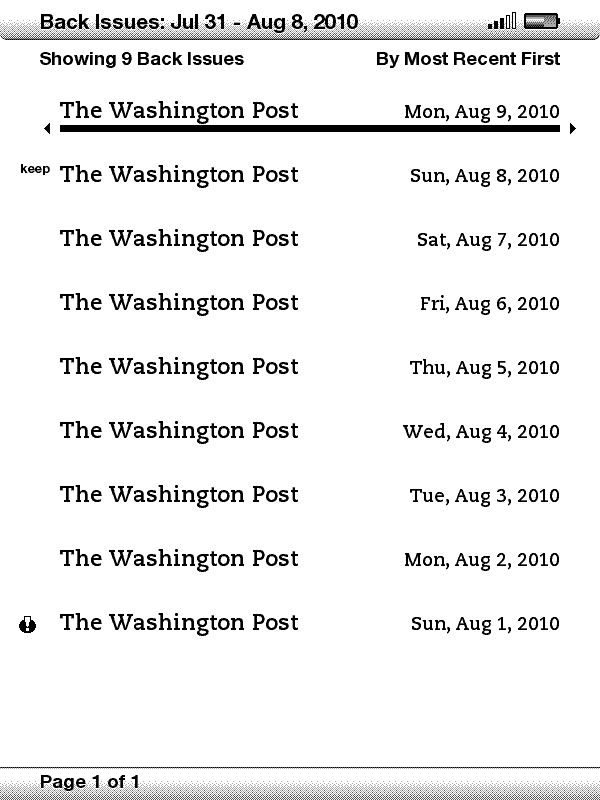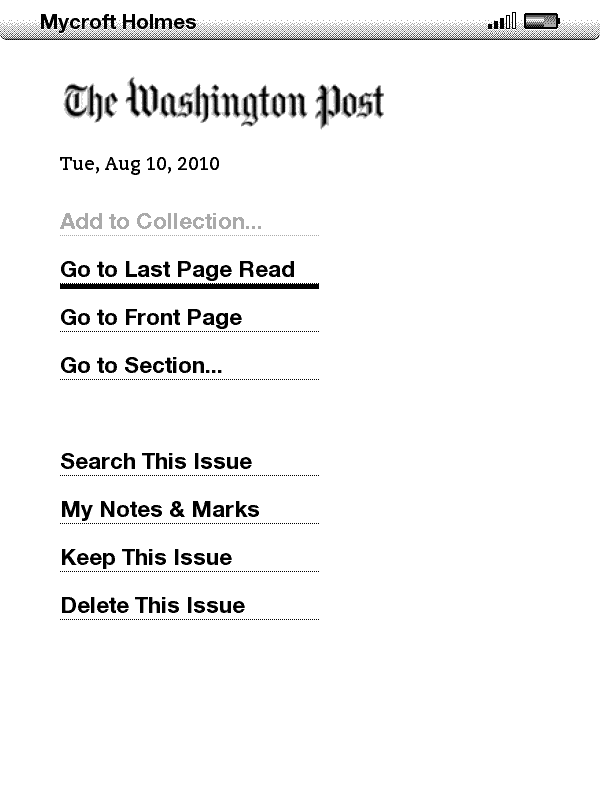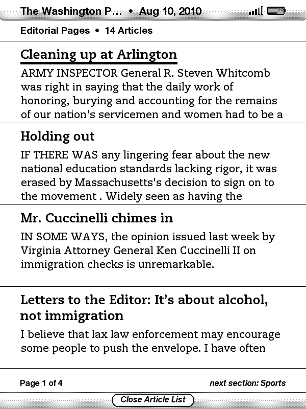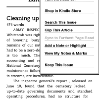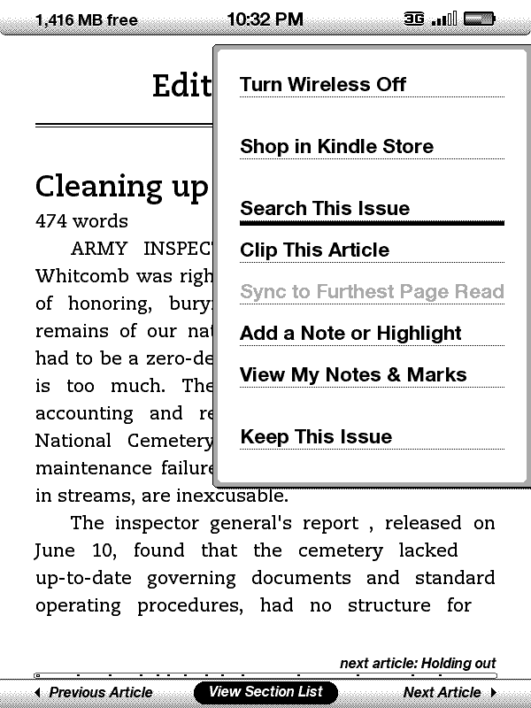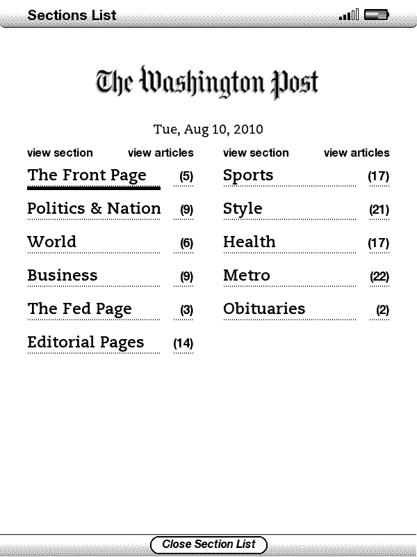Like books on the Kindle, clicking on an issue of a periodical takes you to wherever you were before or, if you haven’t started reading it yet, it takes you to the beginning. For the Post, the beginning is the lead front-page article. Personally, I prefer to go to the issue’s information page (again, same way as on a book) and go to its content page and select the ‘view articles’ link showing the number of articles from there. That gives me a quick overview of what’s in that section and I can choose articles that look interesting (and ignore the rest). You can press the ‘Back’ button (below the five-way navigator) to jump back to the section list.