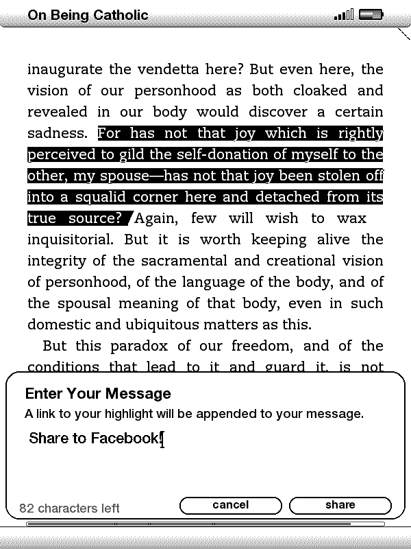 The Kindle, as of software version 2.5, also has the ability to post passages of what you’re reading to Twitter or Facebook. Once you’ve set it up to link to your social networking account, you just highlight the text you want to share and press “Alt-Enter” on the keyboard. Then you can enter your comment(s) and press ‘Share.’ In seconds, the Kindle posts it up to your Twitter and/or Facebook account. I probably wouldn’t miss this feature much if it didn’t exist, but it is a nice touch.