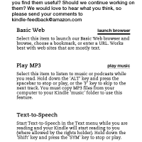 Another useful feature is the ‘text-to-speech’ tool. The Kindle can actually read to you (albeit in a somewhat unnatural computer voice). This isn’t very useful to me at home, but I do use it occasionally in the car. I plug the Kindle’s headphone port into my car’s audio-in port and tell it to start reading, so I can ‘read’ on my way to and from work. There is some room for improvement here; there are only two voices to choose from (male and female), and it does occasionally mangle words bad enough that I have to stop it and look at the screen to see what the heck it tried to say. Generally, however, it does the job and is a very cool feature. Some publishers have chosen to block this feature in certain books—the scourge of DRM strikes again—but the vast majority of books I’ve bought support this, as do all the ones I added on my own from Project Gutenberg.
