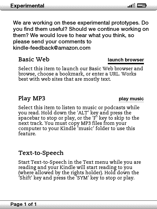 Finally, the Kindle comes with an experimental web browser. When you search Wikipedia, it’s actually just loading Wikipedia pages using this browser. It’s very basic, based on the same old, mediocre NetFront engine that was behind the Palm Blazer browser on old Palm OS phones, but it works . . . sortof. Let’s just say that the Kindle is not a replacement for your smartphone. Browsing is free over the ‘Whispernet,’ at least for now.