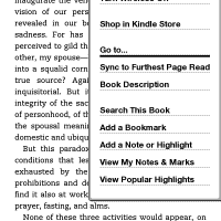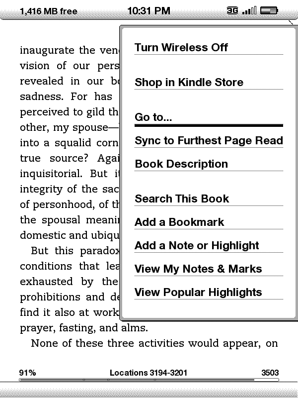 When you’re reading, the screen is very simple. On the top, you get the book’s title, 3G wireless status, and battery status. On the bottom you get an indication bar showing where in the book you are. Other than that, you just get the book. No distractions; no interruptions. It’s just the book. You can also press the ‘Menu’ button to get a little more information and a number of options (similar to those on the book’s information screen). From here you can also bookmark the page, or add your own annotation. I like to highlight interesting passages and add a note so I can come back and find them later, and the Kindle actually syncs these up to their servers (along with your position in the book) so you can read your notes on any of the other Kindle apps . . . at least in books you bought from Amazon.