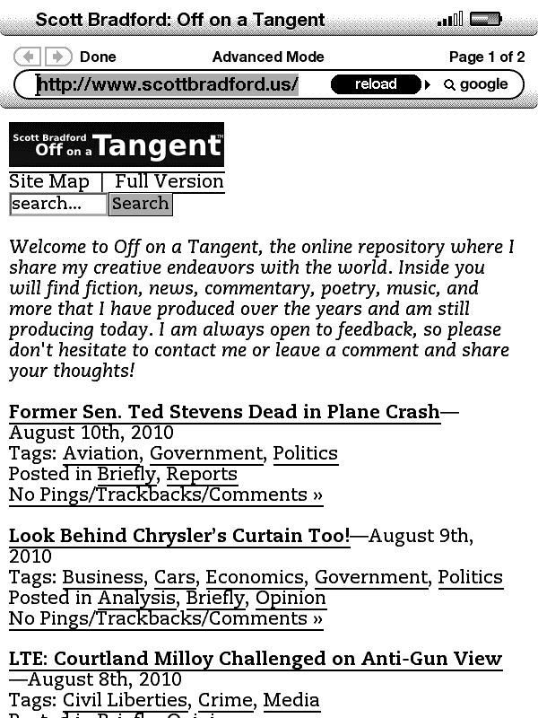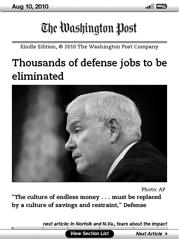 All-in-all, I think that the Post is probably worth $11.99/mo. . . .but just barely. It’s hard to justify paying anything for something that is basically free on the Internet. The cost of most newspapers’ and magazines’ Kindle editions is somewhere between the online price (usually $0) and the paper subscription price. The closer it gets to the online price, however, the better. Unless you spend a lot of your time reading a particular paper or magazine’s stuff online, the convenience of the Kindle edition probably isn’t worth the cost. However, if you currently subscribe to the paper version of a periodical, you’ll probably save some cash by switching to the Kindle edition. Of course, for many magazines, that means losing the color and probably many of the photos. For a newspaper that’s probably not a big deal.