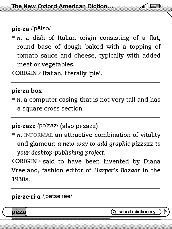 The most useful one, which I use constantly, is the built-in dictionary. Once again, mind-numbingly simple is the name of the game. If you see a word you don’t recognize in whatever you’re reading, just navigate to it using the five-way navigator and wait a second. The definition of that word (or at least the first couple lines of it) will pop up at the bottom of the screen. If you want to see the full-length description, just press the ‘Enter’ key on the keyboard and the full definition pops up. Just press the ‘Back’ button to return right to where you were. You can also search the dictionary from the built-in search mechanism.