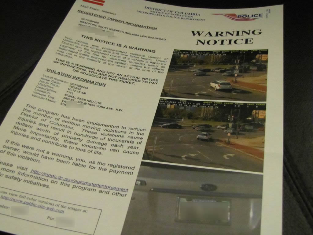 I received a ‘warning notice’ in the mail today because I apparently ran a red light in Washington, DC, on October 23 at 3rd St. and New York Ave. NW. Thankfully it’s just a warning, not an actual citation, but I’ll presumably get a real citation if I ever do it again.