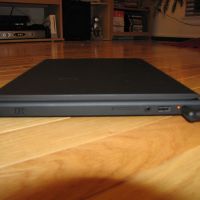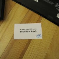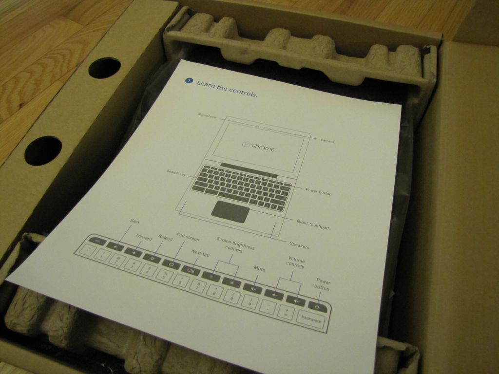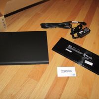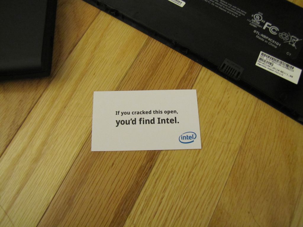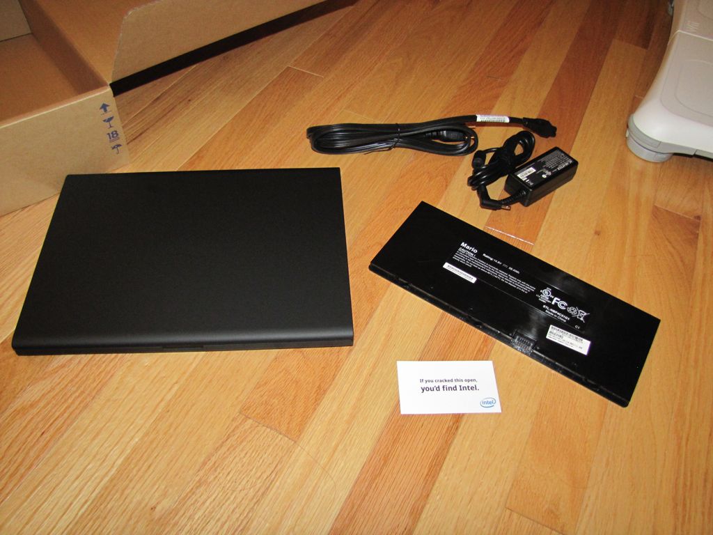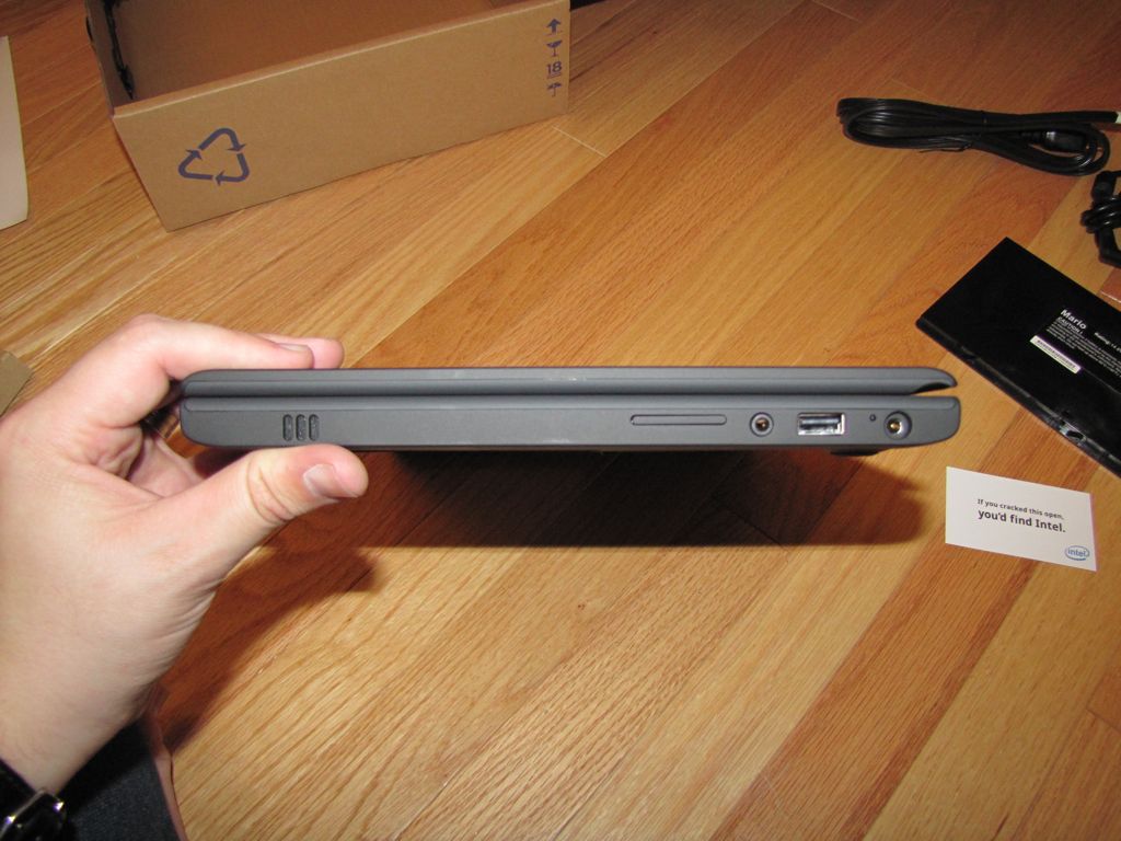 The packaging reminded me very much of the Amazon Kindle packaging—clean, attractive, minimalist, and brown (unlike Apple’s preferred clean, attractive, minimalist, and white or black). On opening it, the laptop was right there ready to pull out with nothing covering it but an attractive, one-page information sheet. There was a small business-card informing me that, if I opened the notebook up, I would find an Intel processor inside. Underneath the laptop itself was its battery and power cable. That’s pretty much all there was.