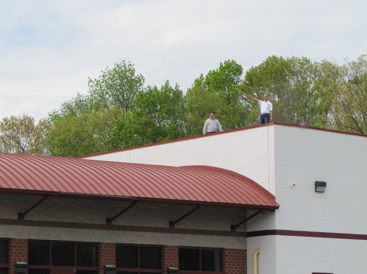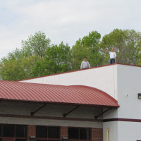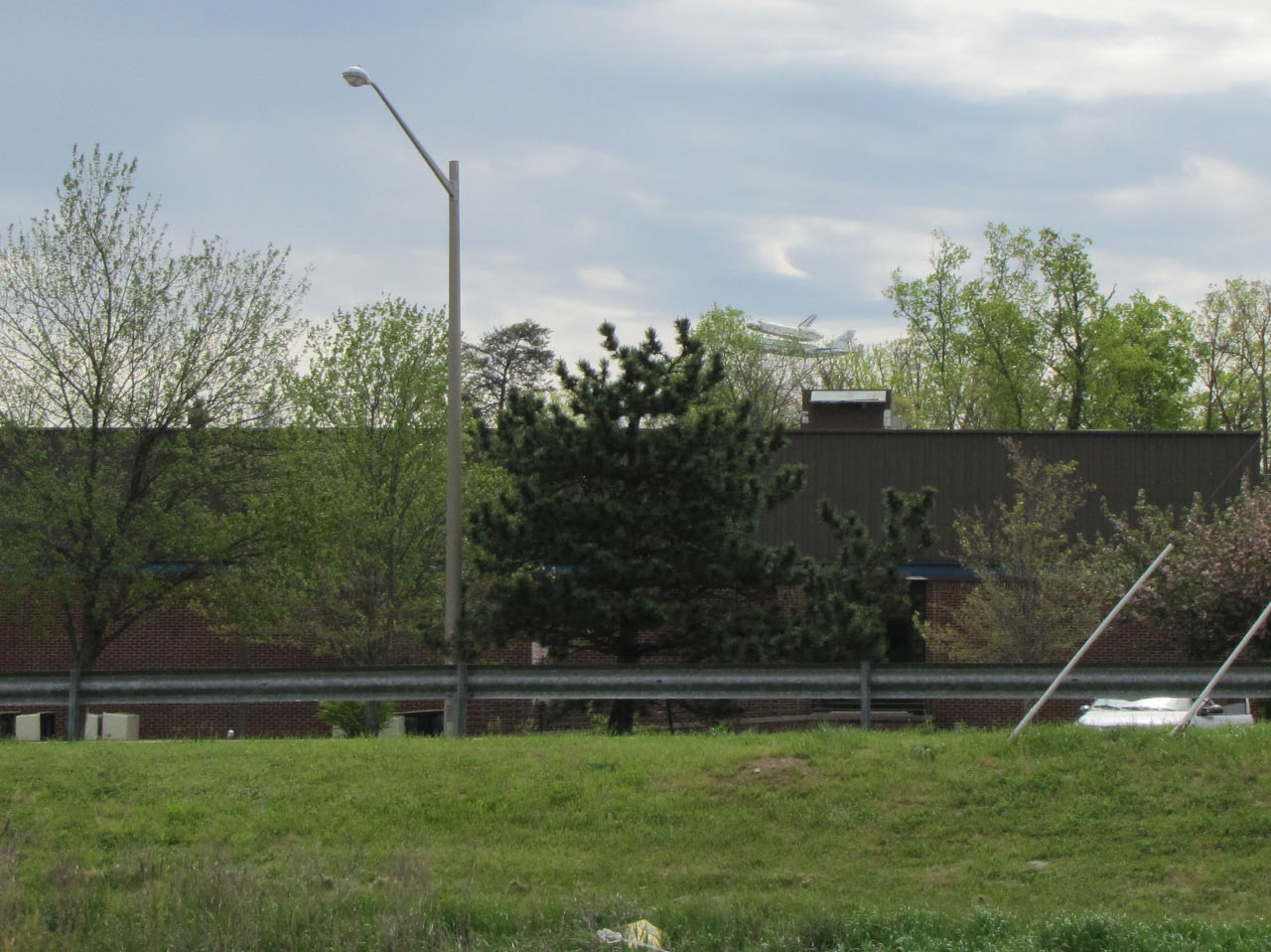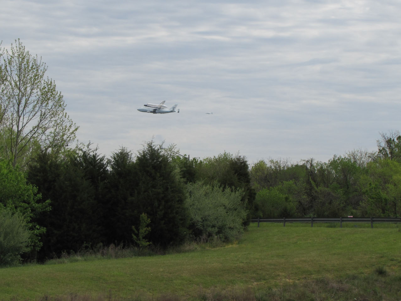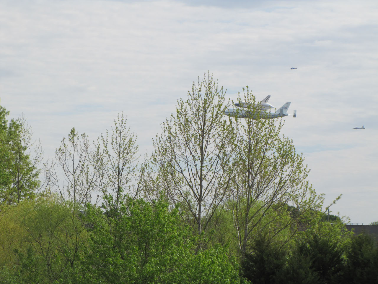Melissa and I had to drop off the Civic, which was recently damaged in a minor accident, at Chantilly Auto Body this morning. I had originally planned to find a closer spot to view the fly-bys, but horrific traffic made us late and favorable weather (presumably) made Discovery early . . . so I snapped a few shots from the auto-body shop instead.