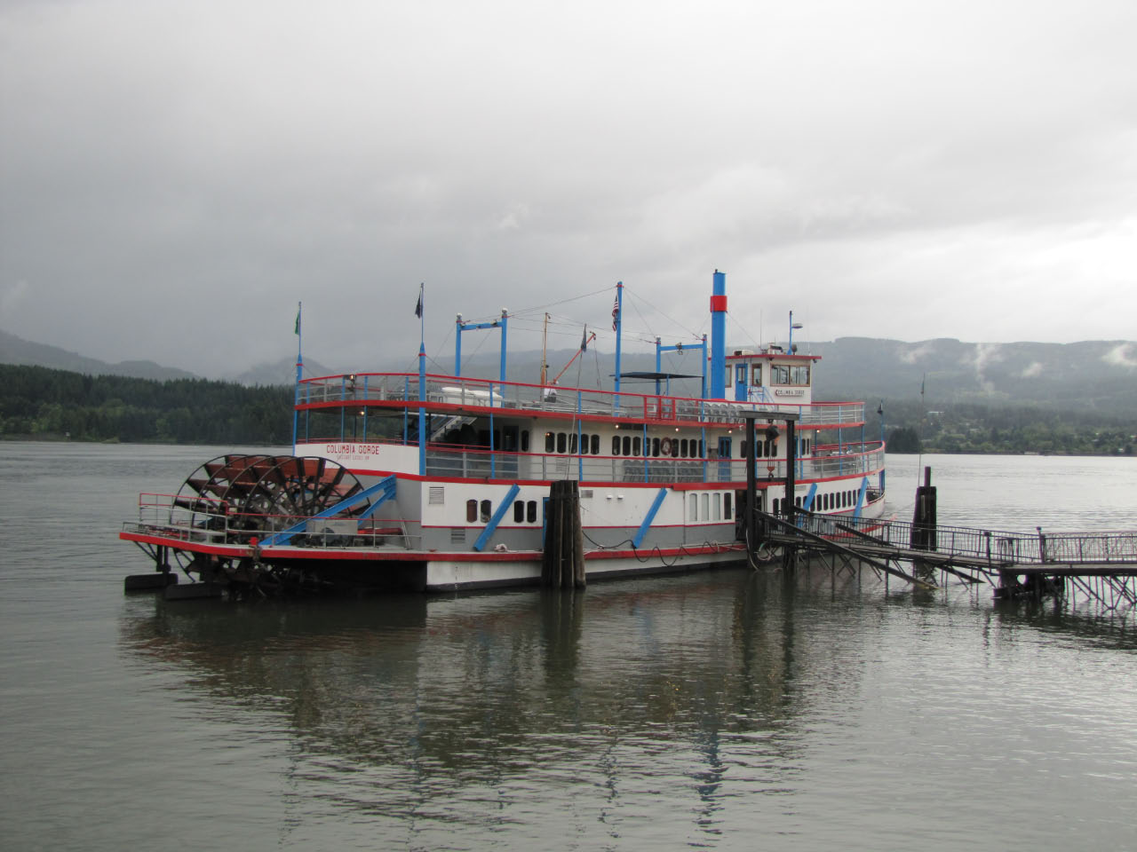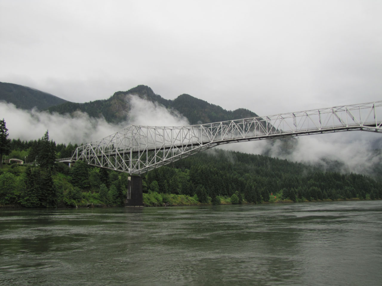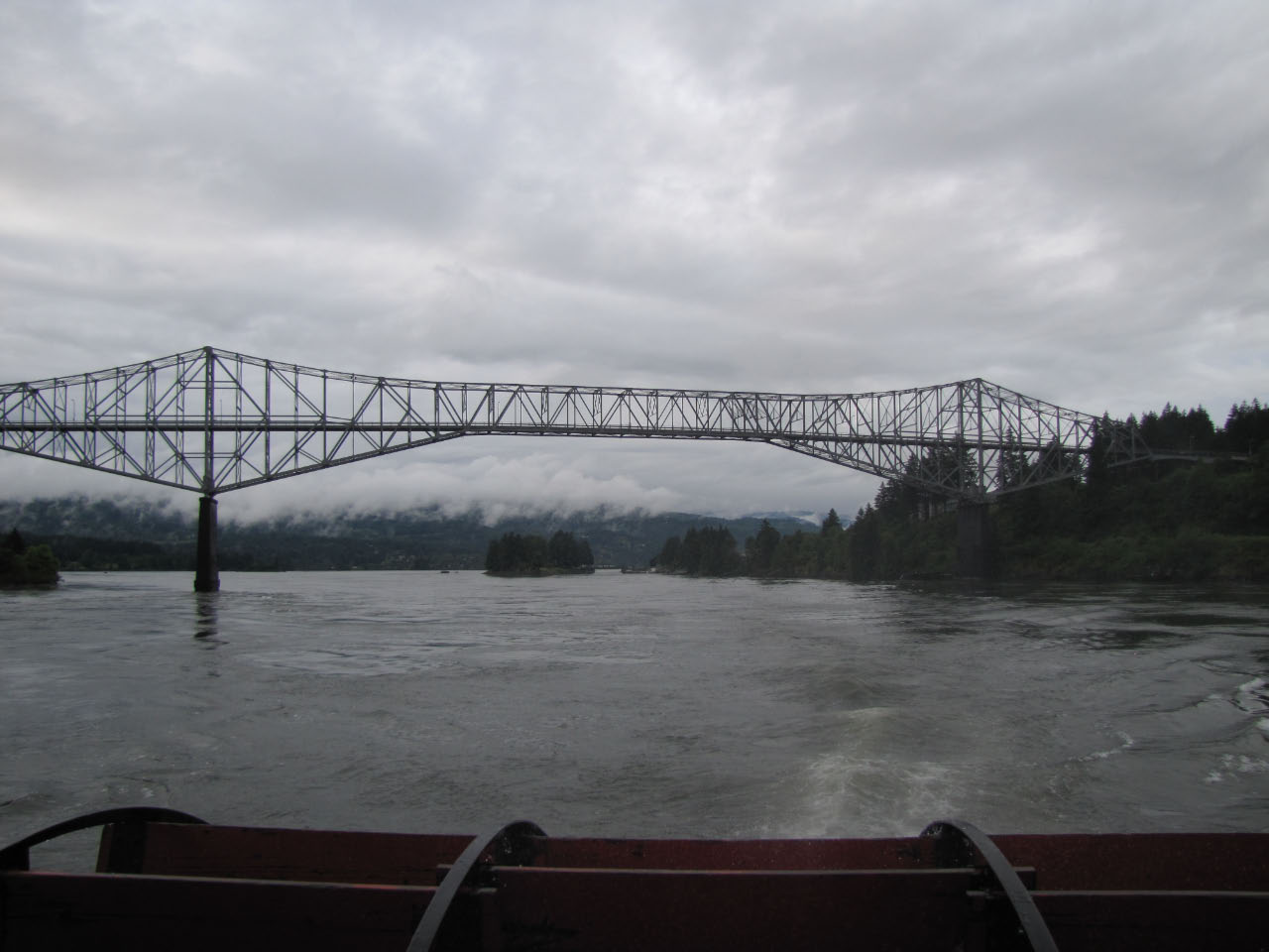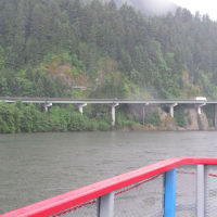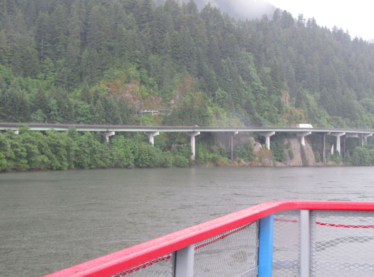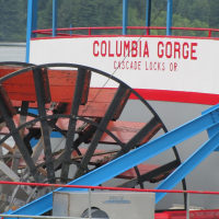 Then, after a rest back at the house, we drove out to the town of Cascade Locks, Oregon, to board the Columbia Gorge sternwheeler for a dinner cruise. The food was okay, but the views of the cloud-covered Columbia Gorge (and a different angle on the Bonneville Dam) were pretty impressive.