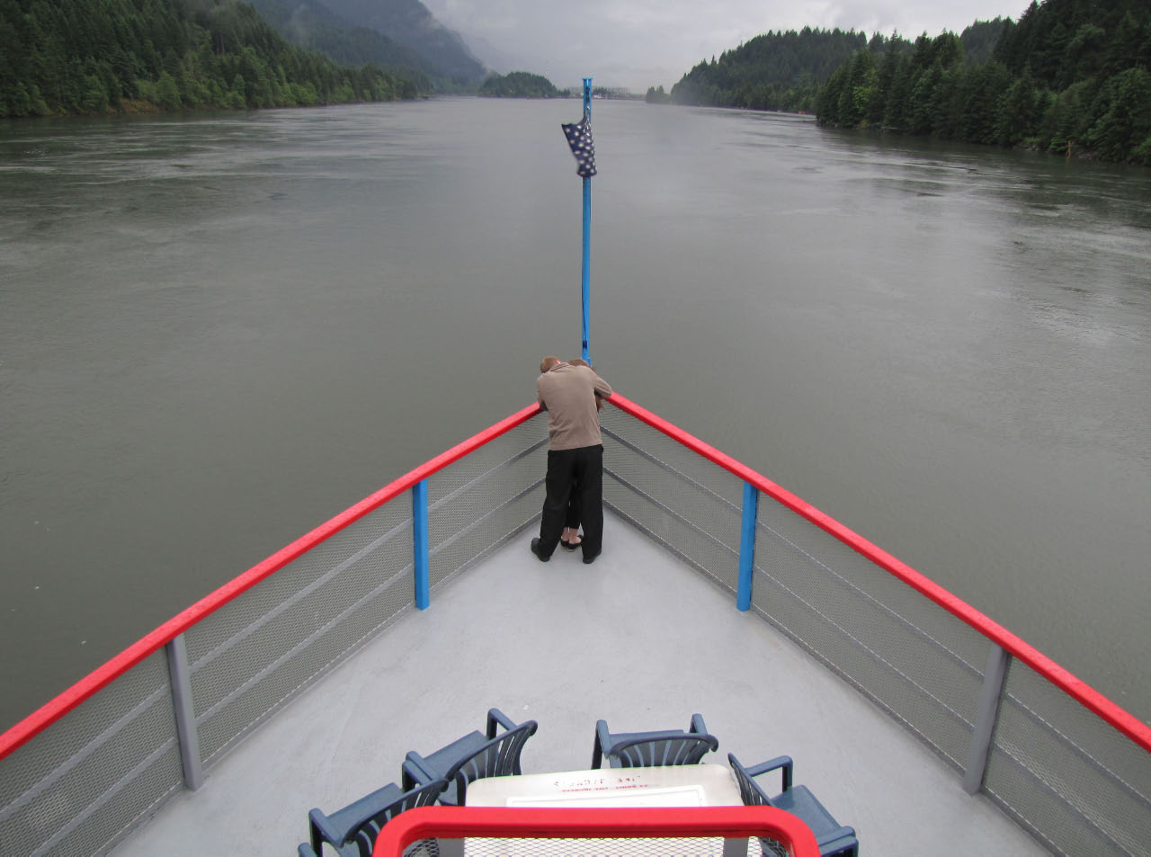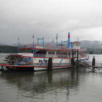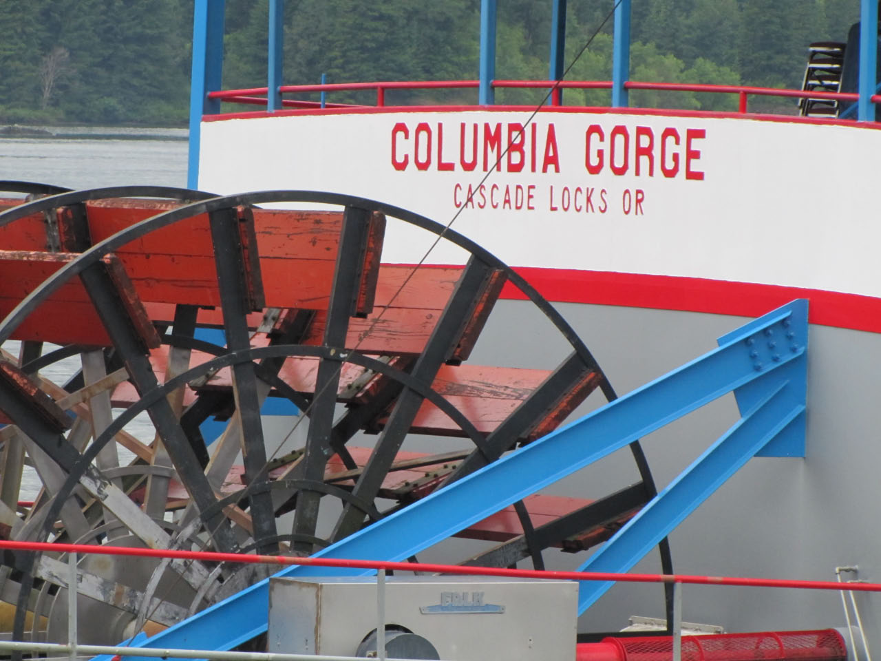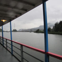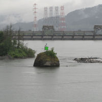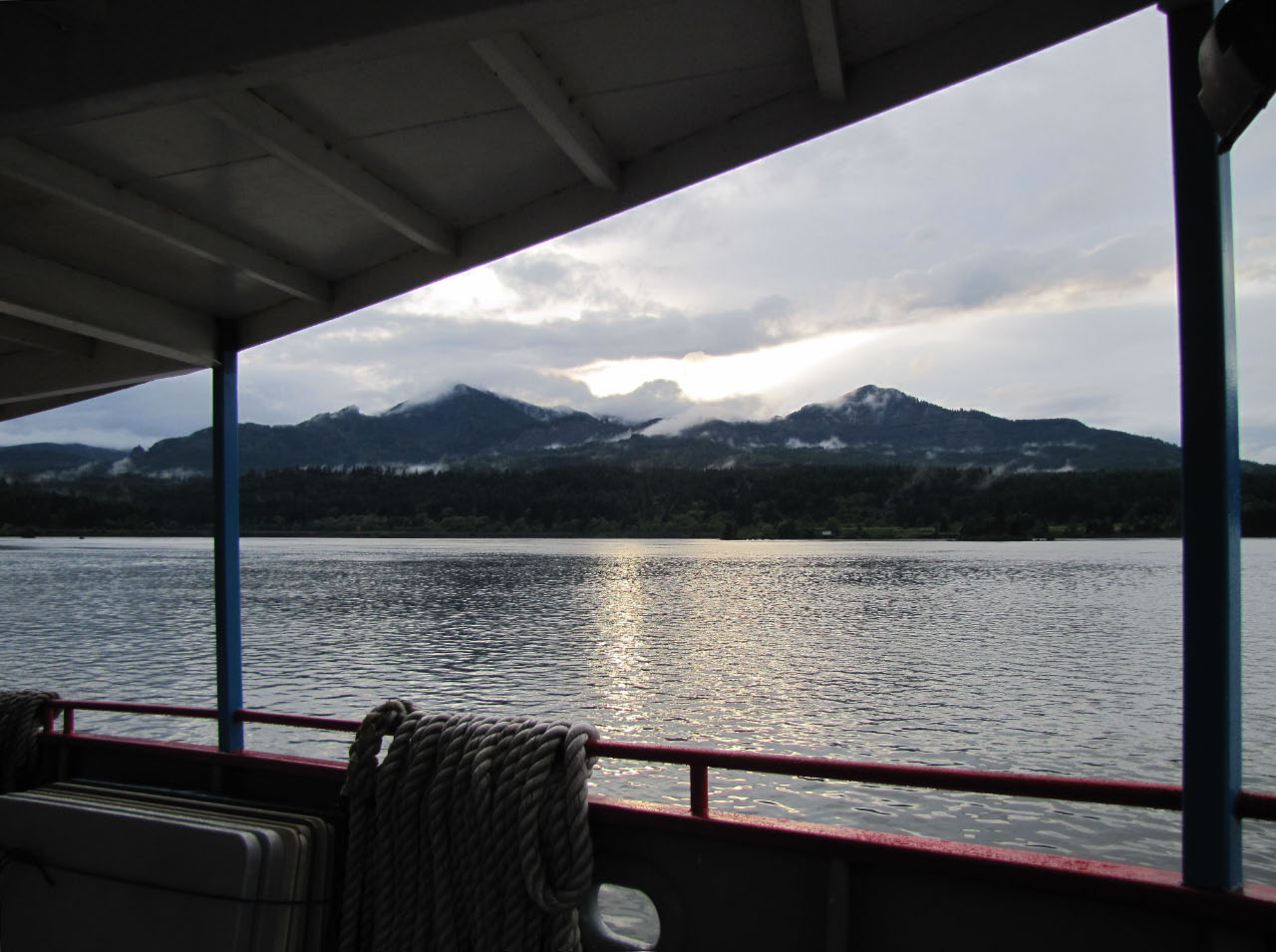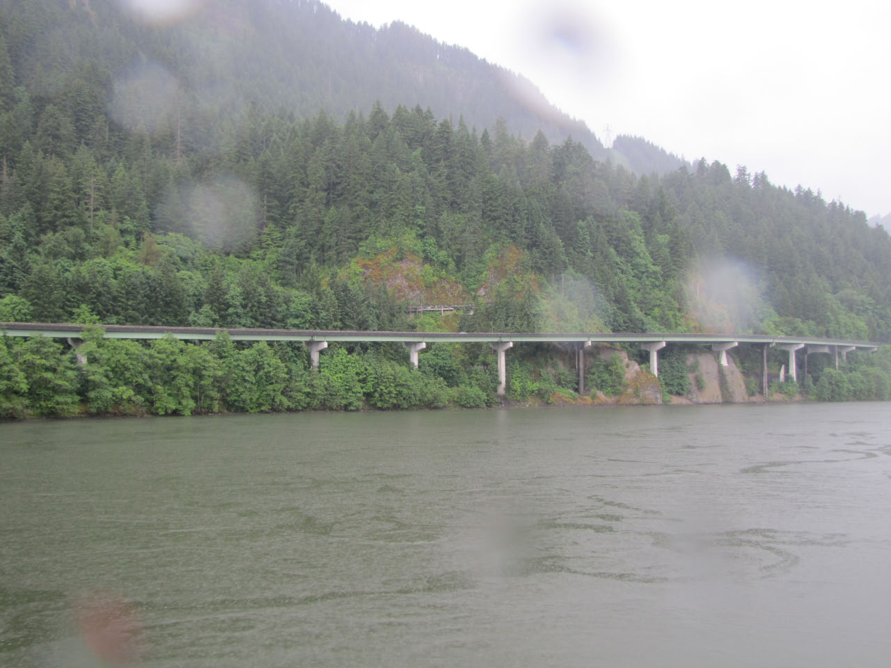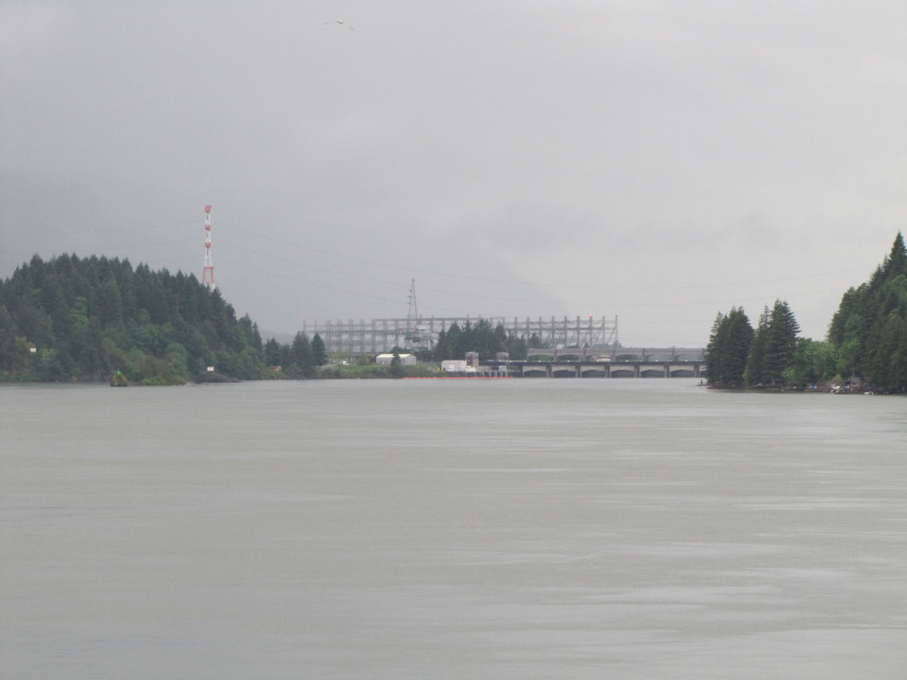 Then, after a rest back at the house, we drove out to the town of Cascade Locks, Oregon, to board the Columbia Gorge sternwheeler for a dinner cruise. The food was okay, but the views of the cloud-covered Columbia Gorge (and a different angle on the Bonneville Dam) were pretty impressive.