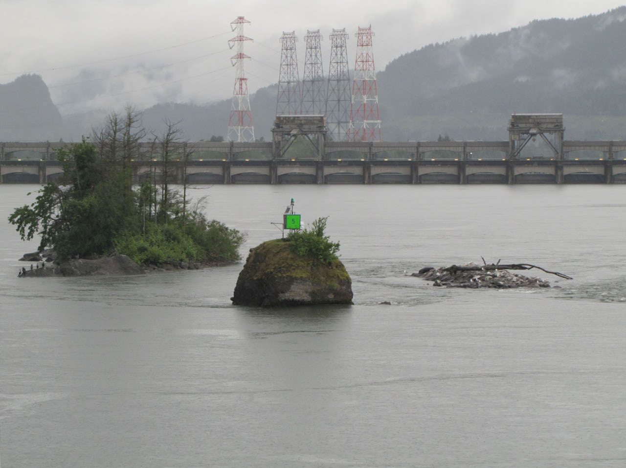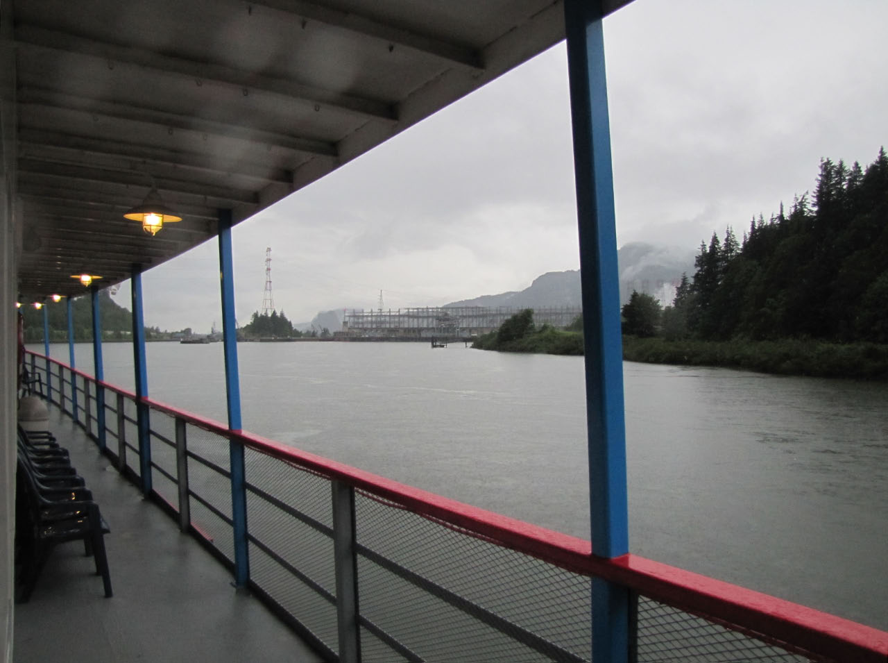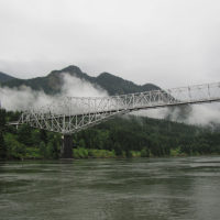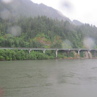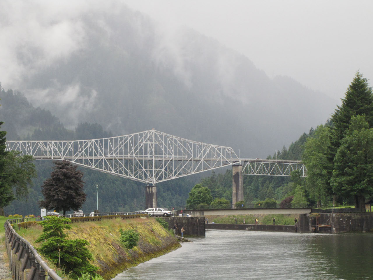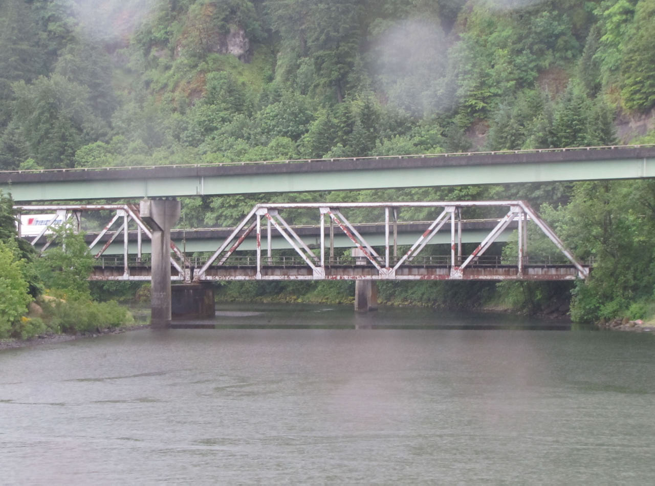Then, after a rest back at the house, we drove out to the town of Cascade Locks, Oregon, to board the Columbia Gorge sternwheeler for a dinner cruise. The food was okay, but the views of the cloud-covered Columbia Gorge (and a different angle on the Bonneville Dam) were pretty impressive.